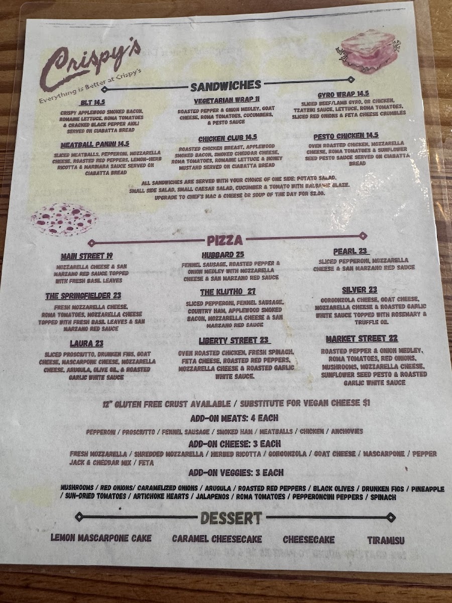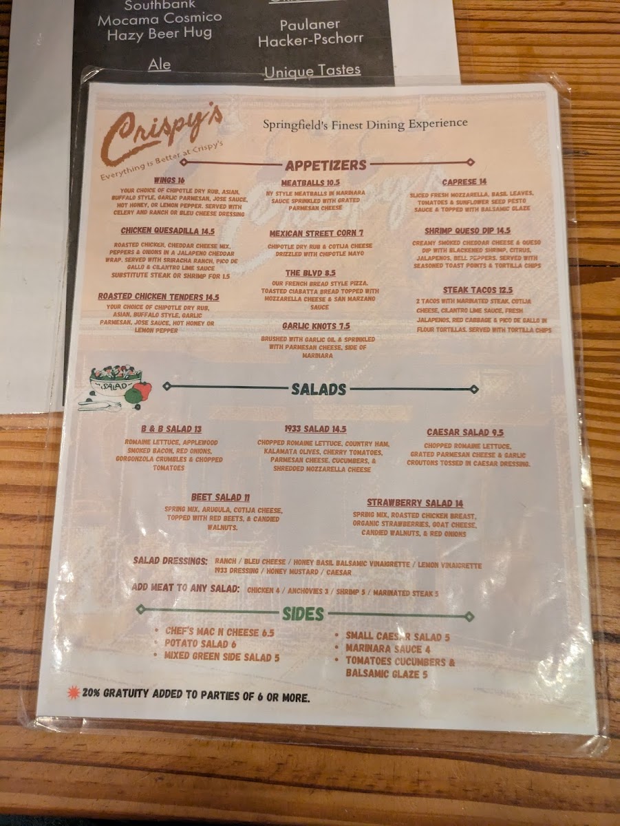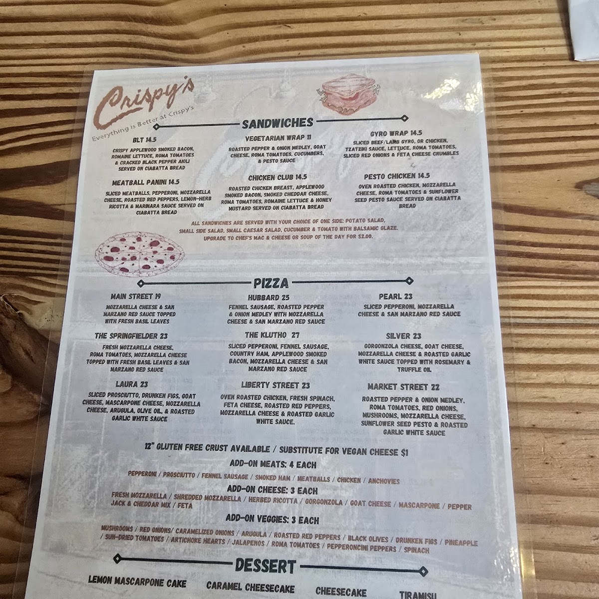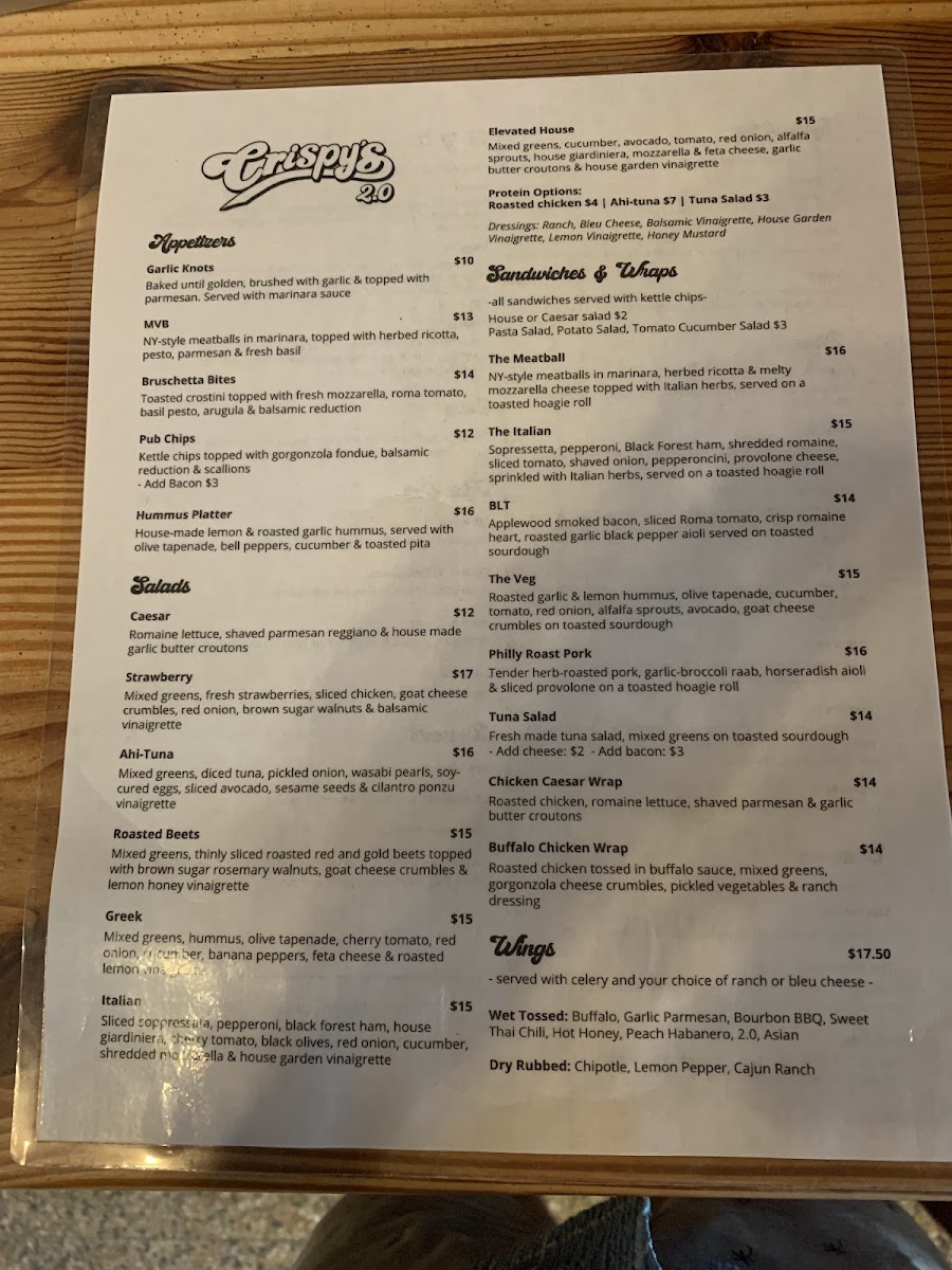 Crispy's was the perfect spot to hit for a local beer and good food. The wings looked great but we choose the pizza instead and it was amazing. Good people and new now ownership so the atmosphere and life is getting better. Worth stopping in!