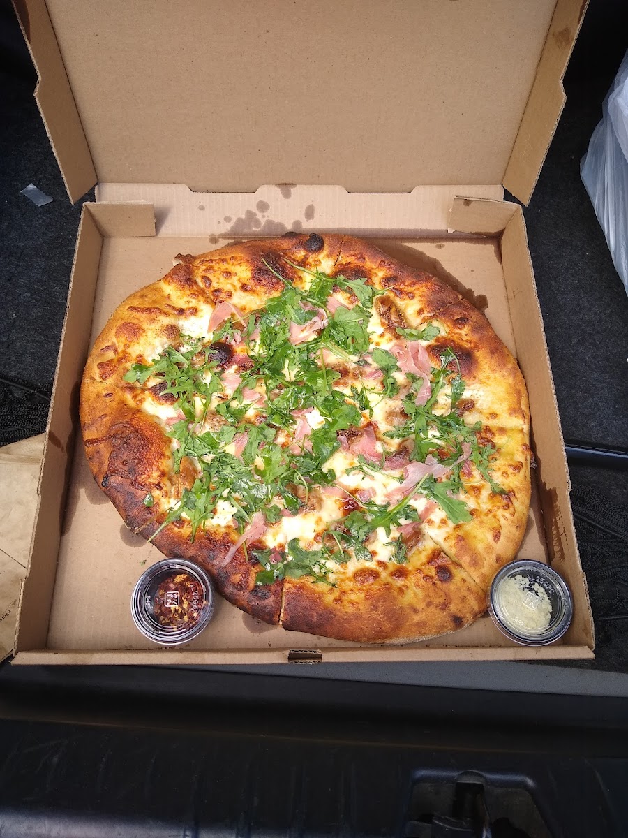 I was here because of a networking event. If you walk in Crispy's and go straight back, you will encounter stairs that take you up to a semi-private 2nd level(where the event was.) It was kind of confusing without any signs or people to guide you. There are AWESOME paintings from local artists on the walls. Some great work to choose from, the paintings are large and available to buy. I ordered "The Silver" pizza - Gorgonzola Cheese, Goat Cheese, Mozzarella Cheese & Roasted Garlic White Sauce Topped with Rosemary & Truffle Oil. The pizza looked good other than the burnt, bubbled up parts on top. It was also concerning how GREASY it was - you can see the box looks drenched in the photo with a slice removed. The smell of rosemary was super overpowering but MAN this thing tasted great! A wonderful blend of flavors, I really enjoyed it except for the burnt parts. The people were nice but had trouble finding my order because I ordered online. ? Finding parking was hard and I had to walk a couple of blocks. Overall, great late night spot for pizza. I'd go back to try more.